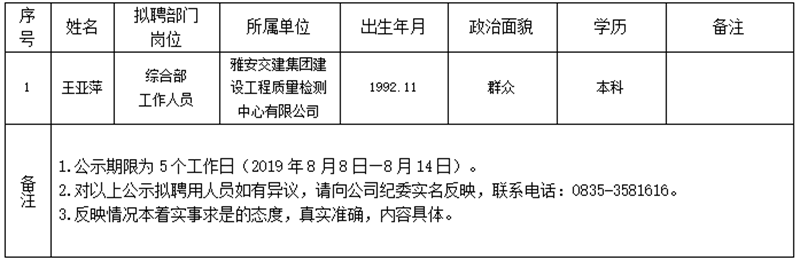 雅安交建集團(tuán)子公司擬聘用人員公示(工程質(zhì)量檢測(cè)中心)