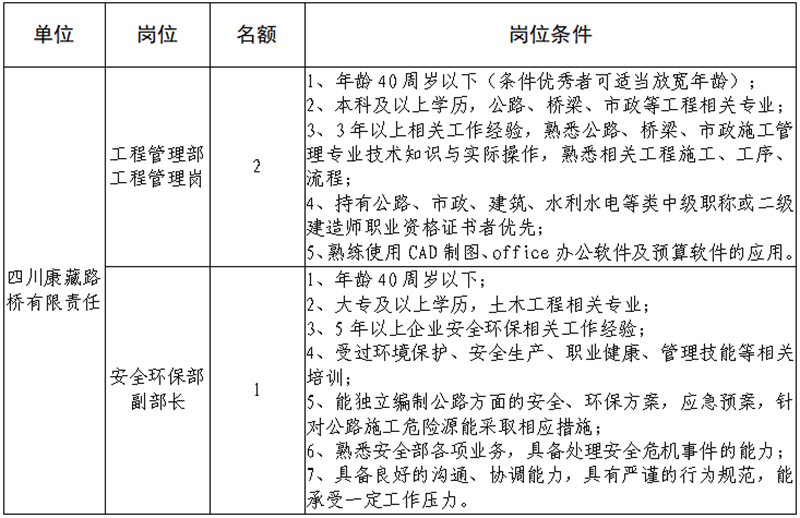 根據(jù)發(fā)展需要,決定面向社會公開招聘雅安市交通建設(shè)(集團(tuán))有限責(zé)任公司(以下簡稱“雅安交建集團(tuán)”)所屬子公司相關(guān)人員3名,現(xiàn)將有關(guān)事項(xiàng)公告如下: