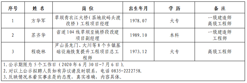 雅安市交通建設(集團)有限責任公司擬聘用人員公示(項目管理公司人才引進)