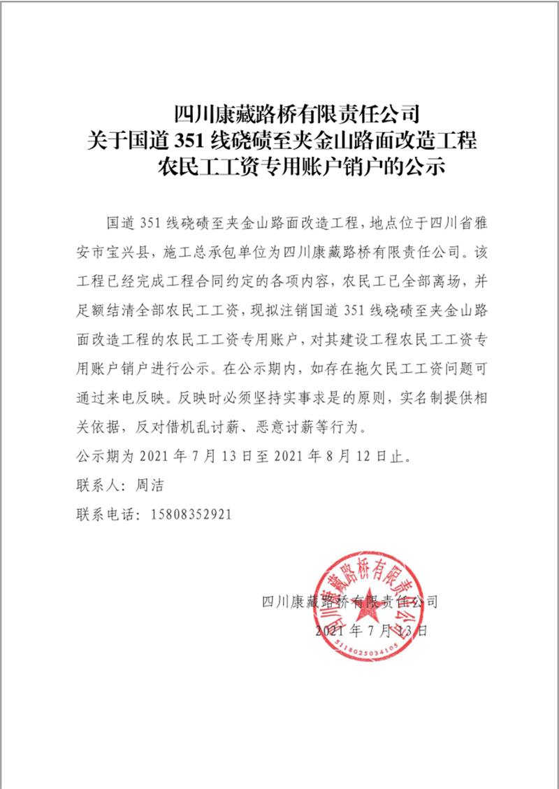 關于國道351線磽磧至夾金山路面改造工程農(nóng)民工工資專用賬戶銷戶的公示