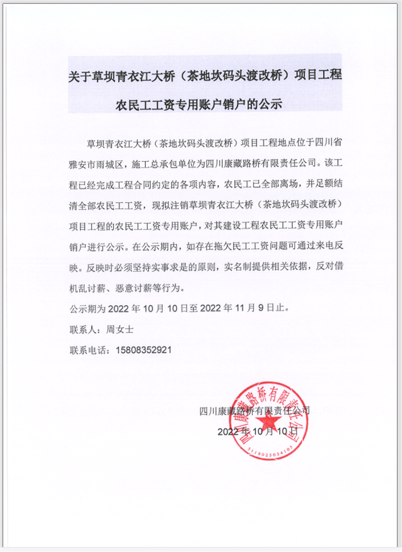 關(guān)于草壩青衣江大橋(茶地坎碼頭渡改橋)項(xiàng)目工程農(nóng)民工工資專(zhuān)用賬戶(hù)銷(xiāo)戶(hù)的公告