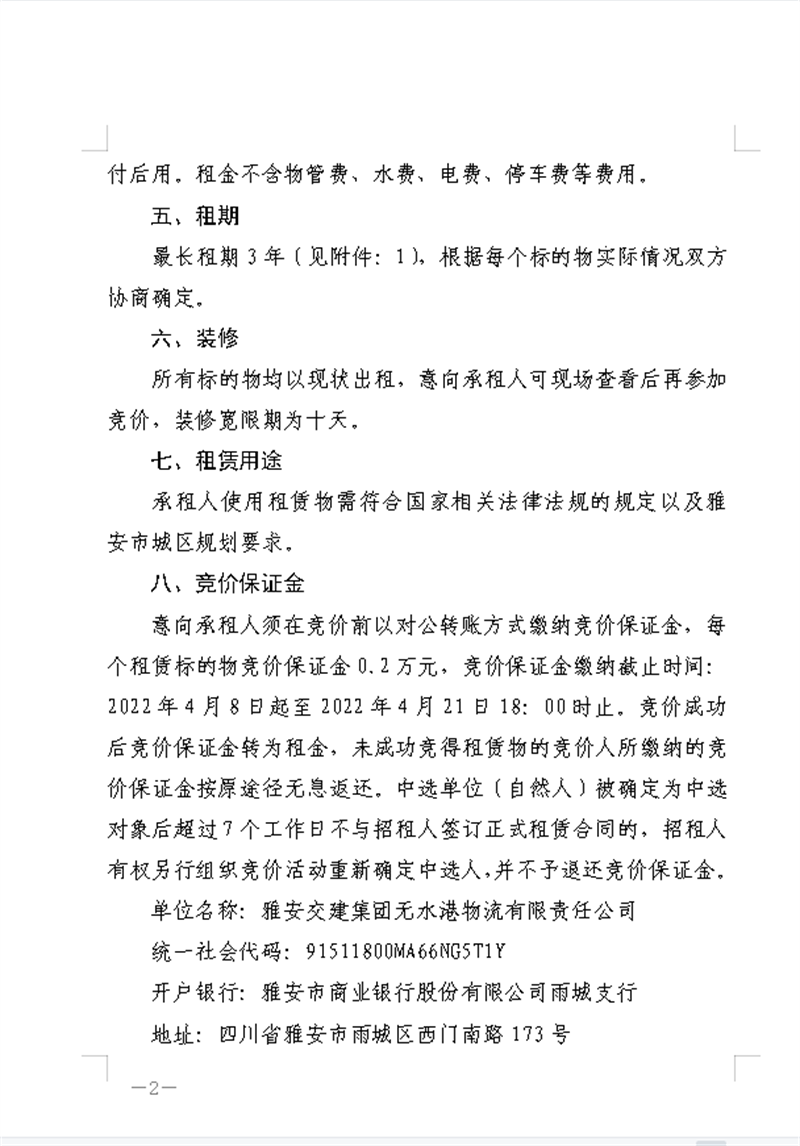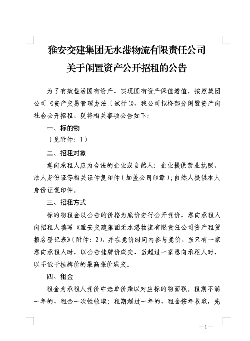 雅安交建集團無水港物流有限責(zé)任公司關(guān)于資產(chǎn)掛網(wǎng)招租的公告