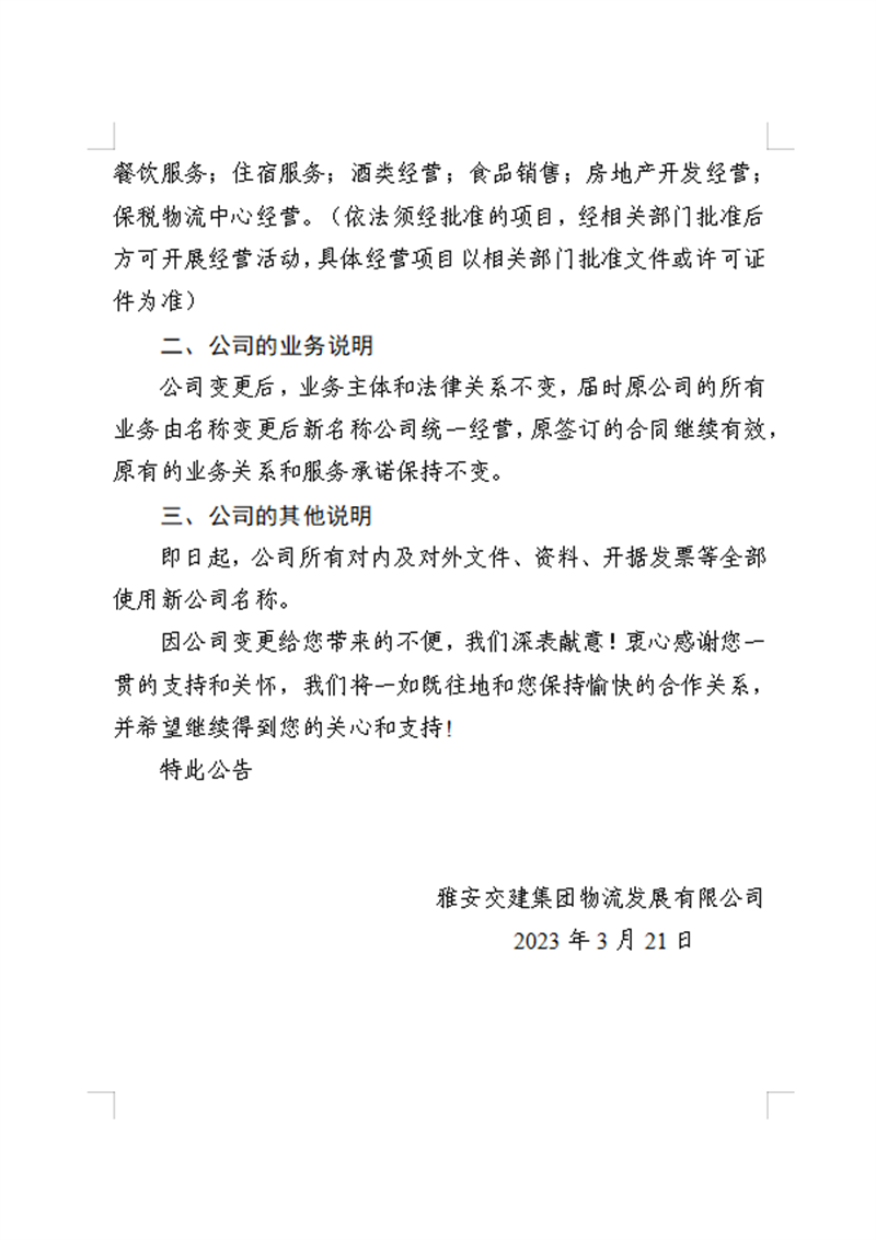 雅安交建集團(tuán)物流發(fā)展有限公司關(guān)于雅安交建集團(tuán)無(wú)水港物流有限責(zé)任公司工商變更的公告