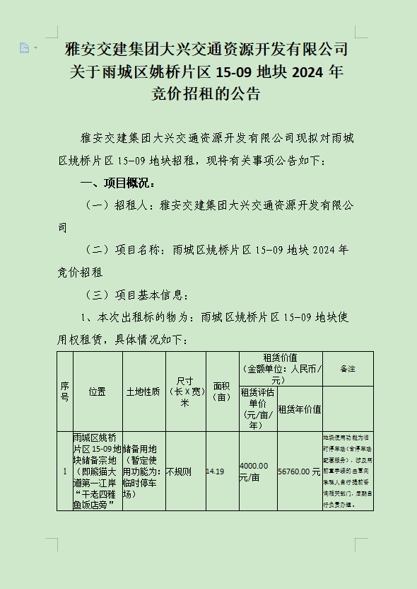 雅安交建集團大興交通資源開發(fā)有限公司關(guān)于雨城區(qū)姚橋片區(qū)15-09地塊2024年競價招租的公告