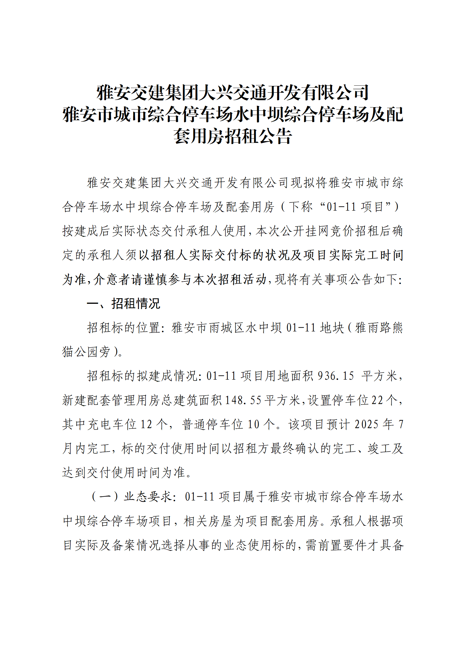 雅安交建集團(tuán)大興交通開發(fā)有限公司 雅安市城市綜合停車場(chǎng)水中壩綜合停車場(chǎng)及配套用房招租公告