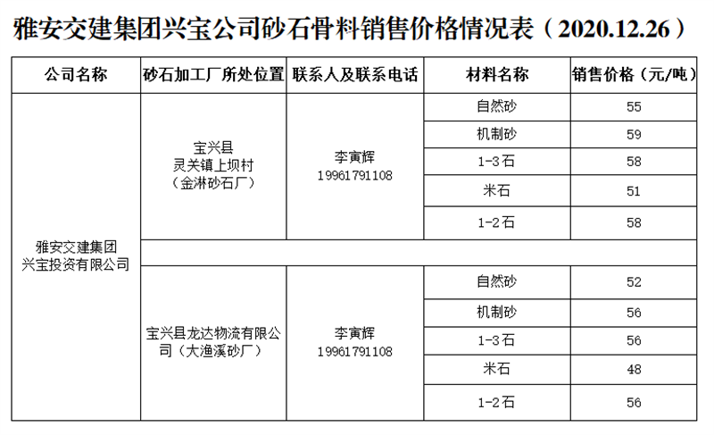 雅安交建集團(tuán)興寶公司砂石骨料銷售價(jià)格情況表(2020.12.26)