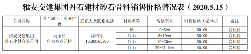 丹石建材有限公司。丹石公司是天全縣人民政府指定天全縣二郎山文化旅游投資開發(fā)有限公司與雅安市交通建設(shè)(集團(tuán))有限責(zé)任公司共同組建的合資公司。公司通過公開競拍取得儲量2000萬方的魚泉獅子山灰?guī)r礦,并在天全縣魚泉鄉(xiāng)青元村建立砂石骨料生產(chǎn)線,設(shè)計年產(chǎn)能200萬噸。目前,礦山開采項目處于在建階段,砂石生產(chǎn)加工廠區(qū)處于設(shè)備調(diào)試和產(chǎn)能驗(yàn)收階段。生產(chǎn)廠區(qū)距雨城區(qū)中心城區(qū)約50公里。