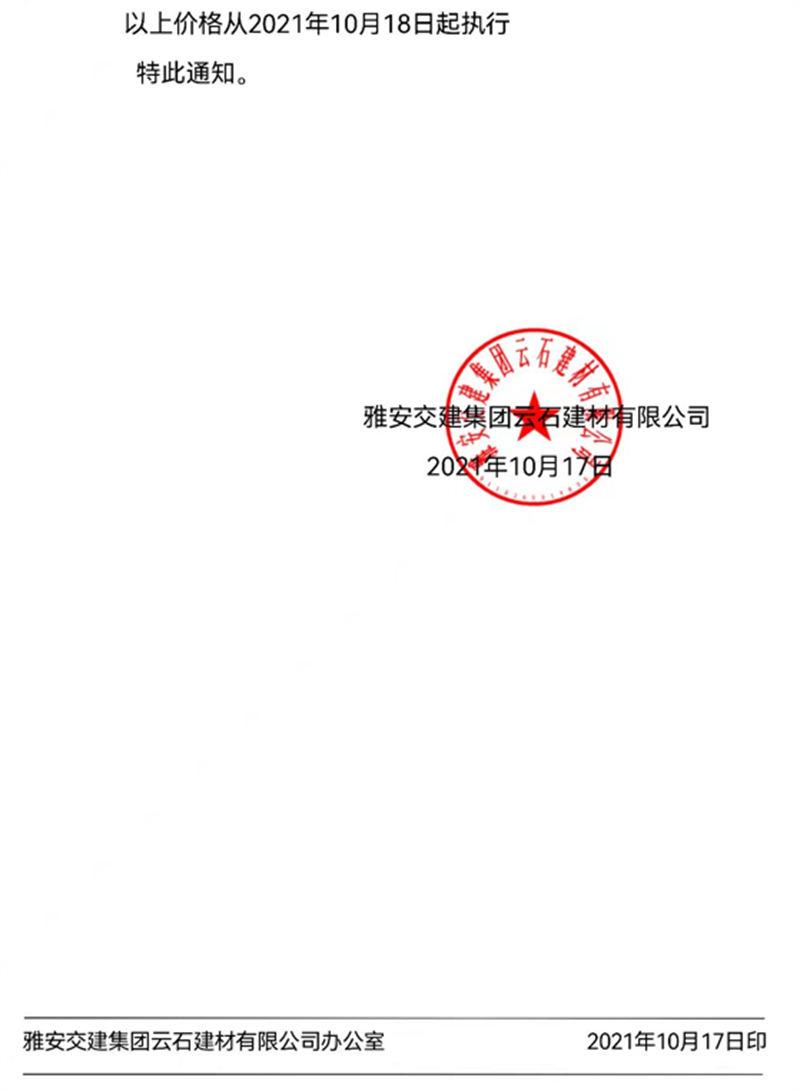 ÑŰ²½»½¨¼¯ˆF(tu¨¢n)ÔÆÊ¯¹«Ë¾êP(gu¨¡n)ÓÚÕ{(di¨¤o)Õû³ÉÆ·ÁÏäN(xi¨¡o)ÊÛƒr(ji¨¤)¸ñµÄ֪ͨ£¨2021.10.17£©