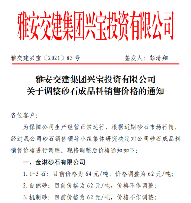 雅安交建集團(tuán)興寶公司關(guān)于調(diào)整成品料銷售價(jià)格的通知(2021.11.26)