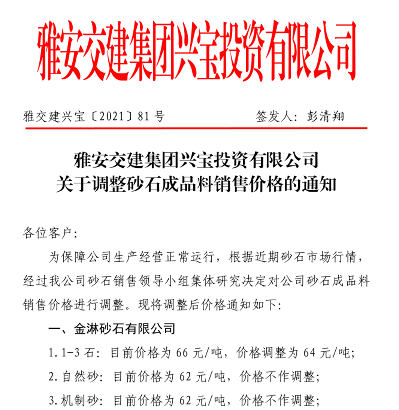 雅安交建集團興寶公司關(guān)于調(diào)整成品料銷售價格的通知(2021.11.23)