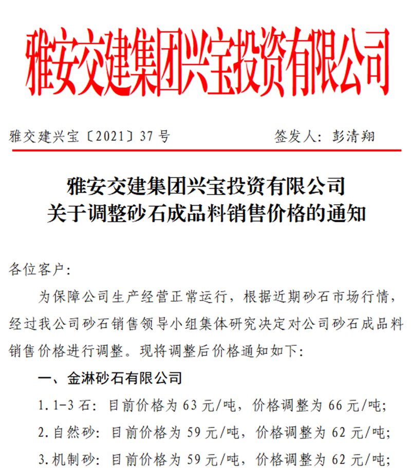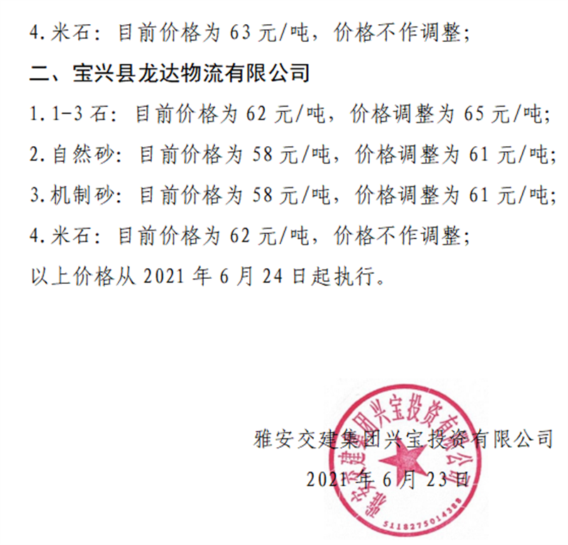 雅安交建集團(tuán)興寶公司砂石骨料銷售價(jià)格情況表(2021.6.23)