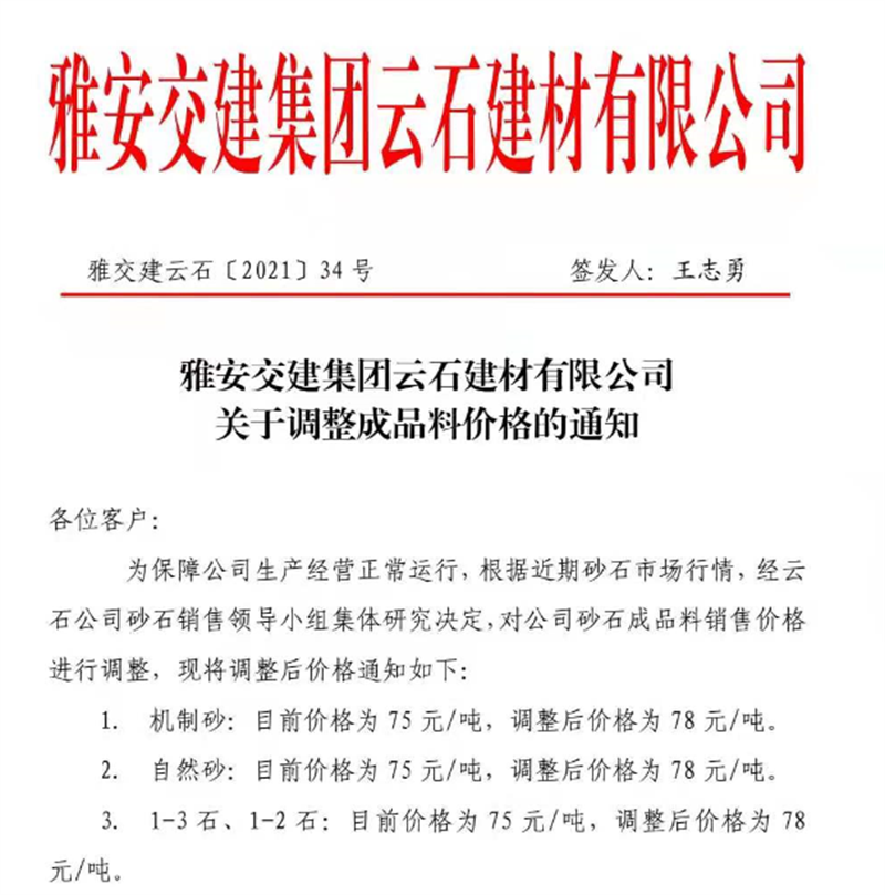 雅安交建集團云石公司砂石骨料銷售價格情況表(2021.7.12)