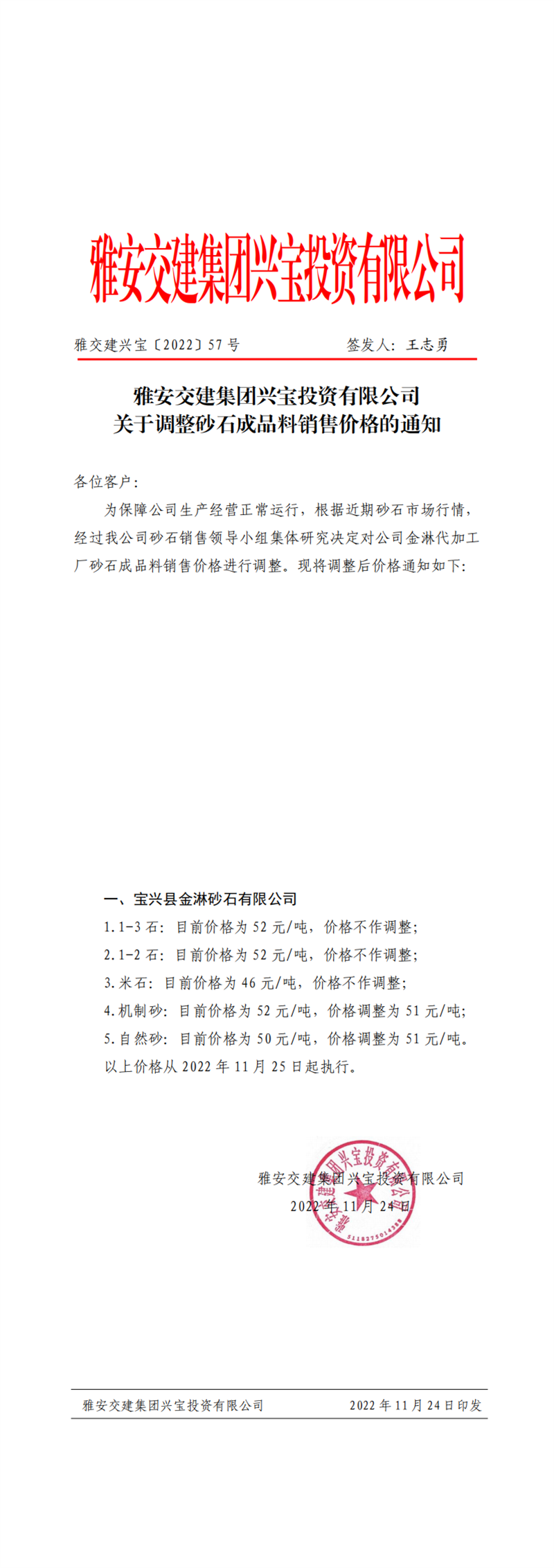 雅交建興寶〔2022〕57號 關于調(diào)整砂石成品料銷售價格的通知--11.24