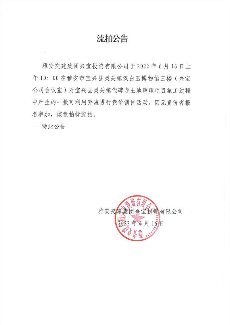 雅安交建集團(tuán)興寶投資有限公司寶興縣靈關(guān)鎮(zhèn)代碑寺土地整理項(xiàng)目-批可利用 棄渣競(jìng)價(jià)銷售公告( 2022.6.15 )