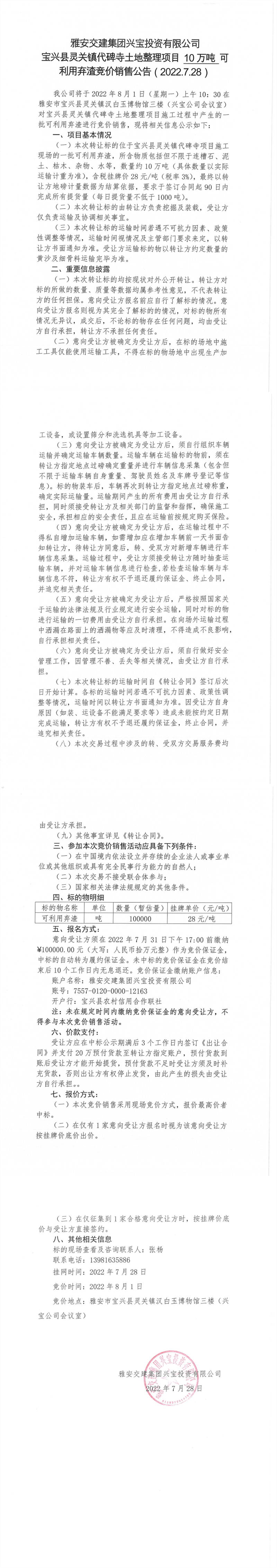 雅安交建集團(tuán)興寶投資有限公司靈關(guān)鎮(zhèn)代碑寺土地整理項(xiàng)目5萬(wàn)噸可利用棄渣競(jìng)價(jià)銷(xiāo)售公告(2022.7.28)