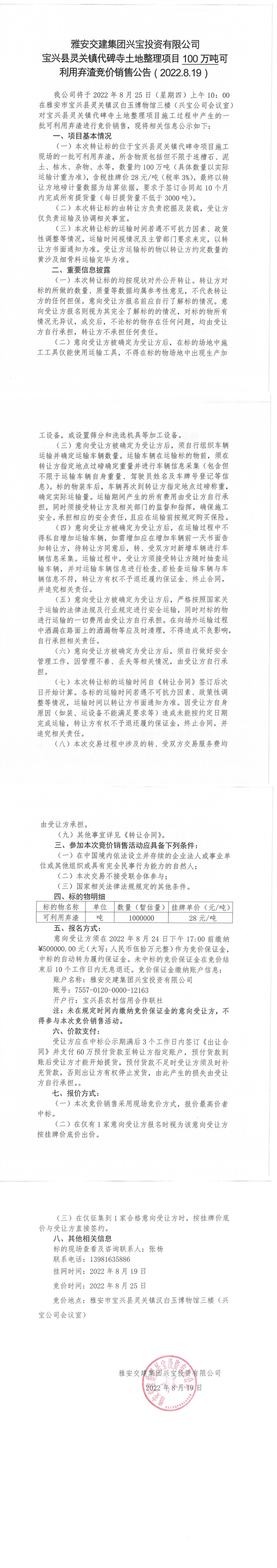 雅安交建集團(tuán)興寶投資有限公司靈關(guān)鎮(zhèn)代碑寺土地整理項(xiàng)目100萬噸可利用棄渣競價(jià)銷售公告(2022.8.19)