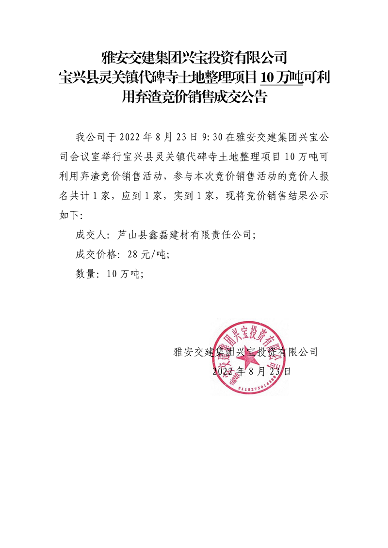 雅安交建集團興寶投資有限公司寶興縣靈關鎮(zhèn)代碑寺土地整理項目5萬噸可利用棄渣競價銷售成交公告(8.23)