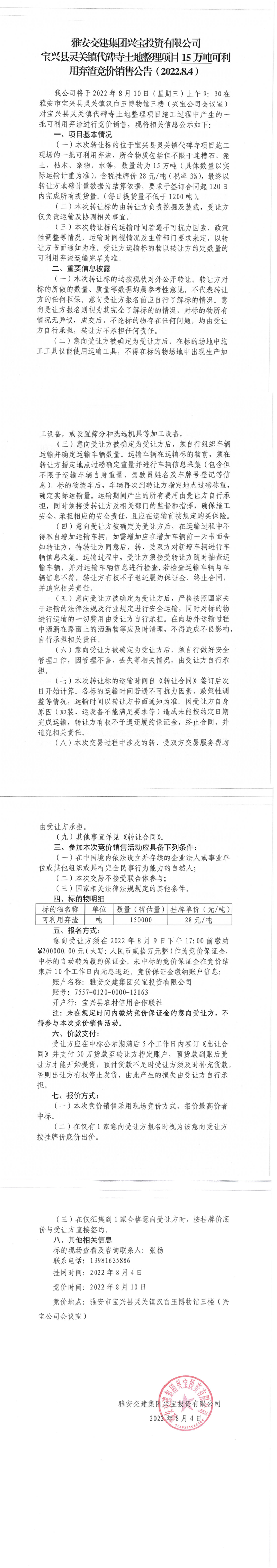 雅安交建集團興寶投資有限公司靈關鎮(zhèn)代碑寺土地整理項目10萬噸可利用棄渣競價銷售公告(2022.8.4)