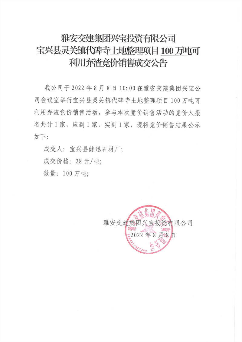 代碑寺土地整理項(xiàng)目100萬噸可利用棄渣競價(jià)銷售成交公告
