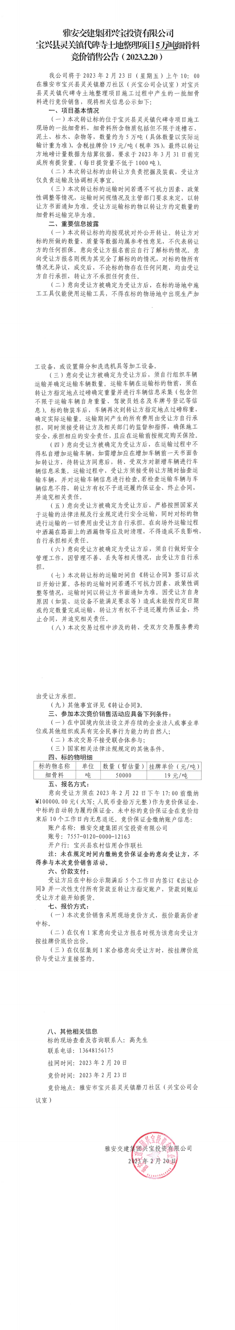 雅安交建集團(tuán)興寶投資有限公司寶興縣靈關(guān)鎮(zhèn)代碑寺土地整理項(xiàng)目5萬噸細(xì)骨料競價(jià)銷售公告(2023.2.20)