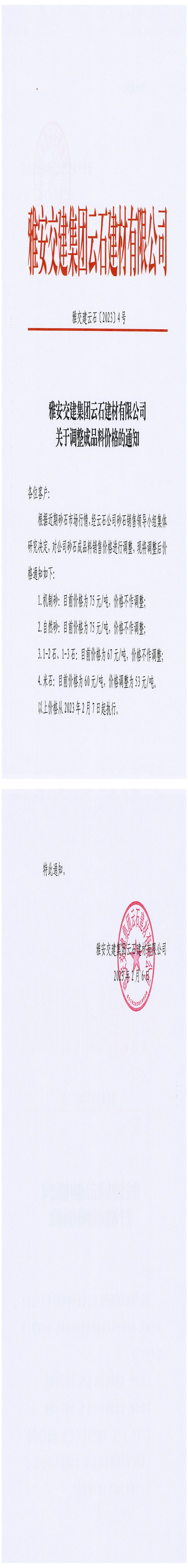 雅安交建集團云石建材有限公司關于調整成品料價格的通知-2023-02-06