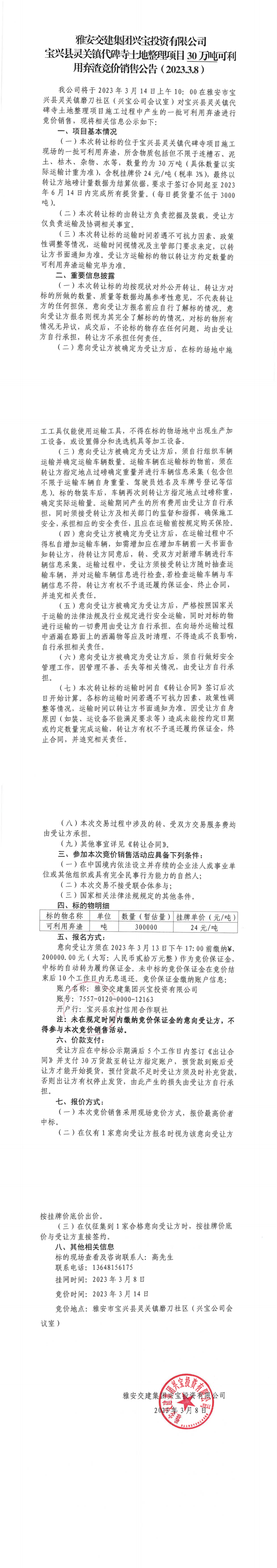 雅安交建集團(tuán)興寶投資有限公司靈關(guān)鎮(zhèn)代碑寺土地整理項(xiàng)目30萬噸可利用棄渣競價(jià)銷售公告(2023.3.8)