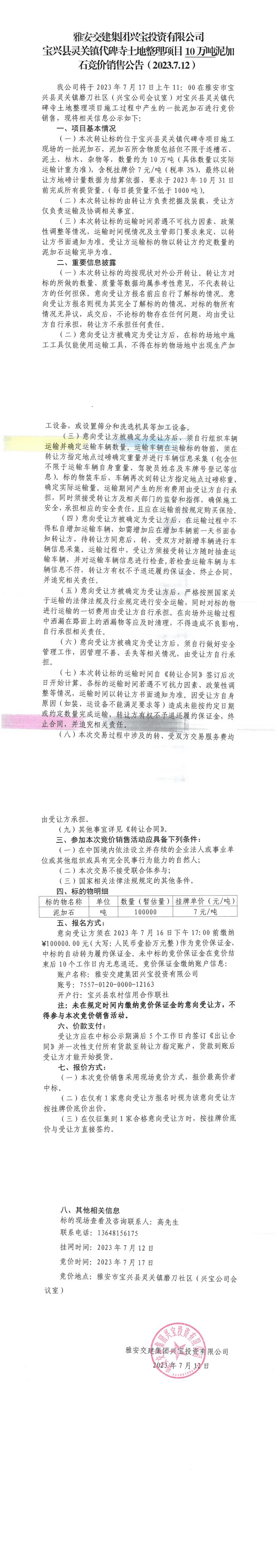 雅安交建集團(tuán)興寶投資有限公司寶興縣靈關(guān)鎮(zhèn)代碑寺土地整理項(xiàng)目10萬(wàn)噸泥加石競(jìng)價(jià)銷(xiāo)售公告(2023.7.12)