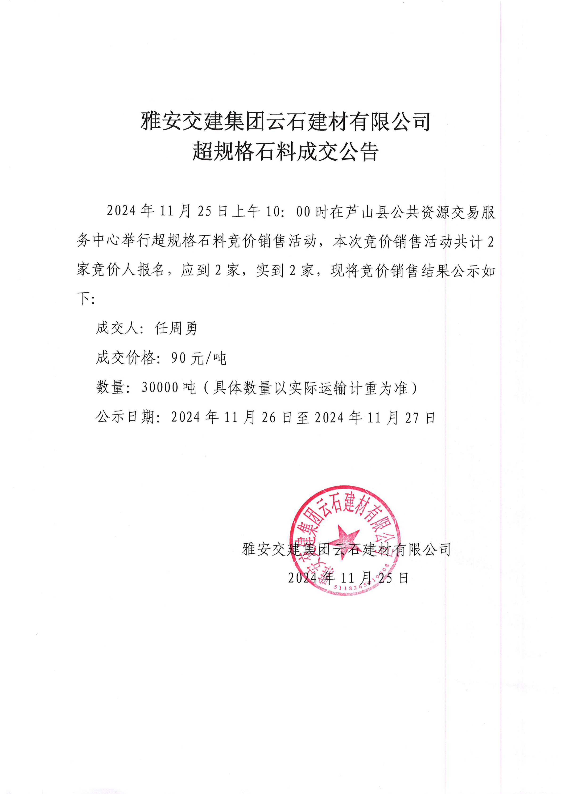 雅安交建集團云石建材有限公司超規(guī)格石料競價銷售成交公告(2024-11-26)
