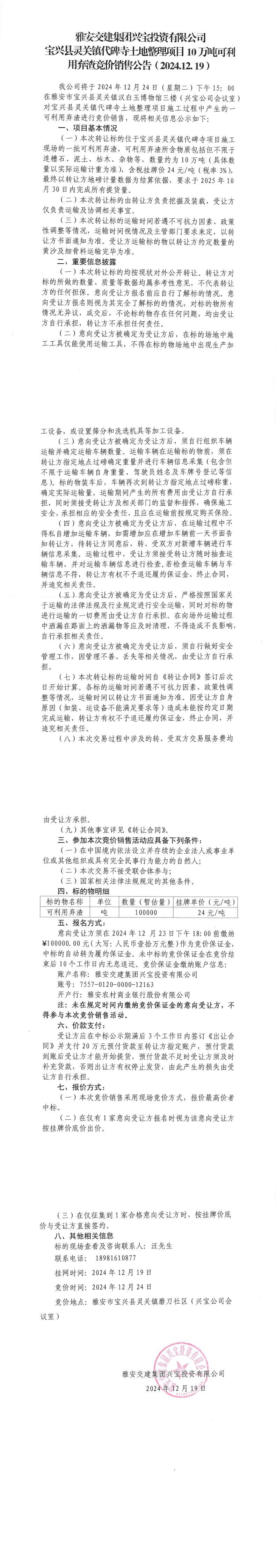 雅安交建集團興寶投資有限公司靈關(guān)鎮(zhèn)代碑寺土地整理項目10萬噸可利用棄渣競價銷售公告(2024.12.19)