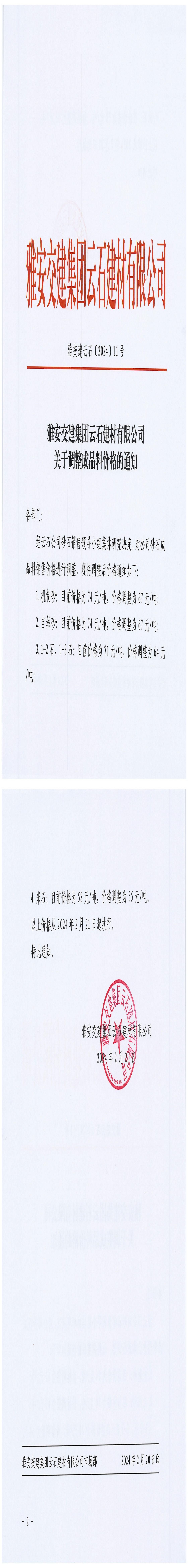 ÑŰ²½»½¨¼¯ˆF(tu¨¢n)ÔÆÊ¯½¨²ÄÓÐÏÞ¹«Ë¾³ÉÆ·Áσr(ji¨¤)¸ñÕ{(di¨¤o)Õû¹«¸æ£¨2024-2-21£©