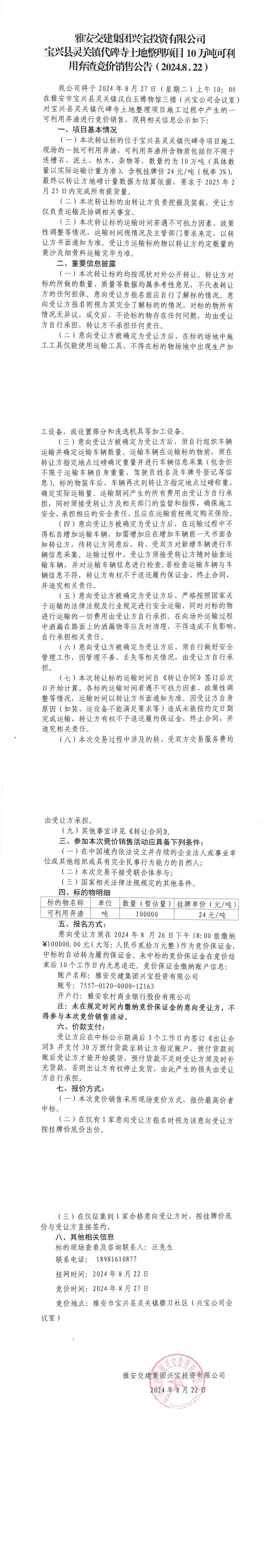 雅安交建集團興寶投資有限公司寶興縣靈關鎮(zhèn)代碑寺土地整理項目10萬噸可利用棄渣競價銷售公告(2024-8-22)_0